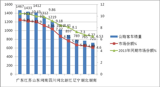 根据上牌数据统计,将2014年1-7月11-12米公路客车共计销售15687辆,其中产品销量在前10名的全国主流区域市场列表如下:
