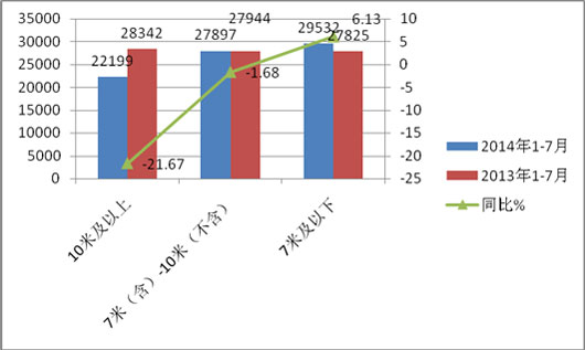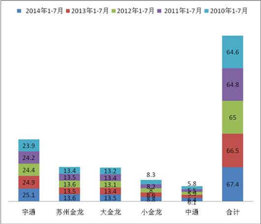 特点一、2014年1-7月公路客车市场销量同比降幅为5.33%,是近5年来同比第一次下降幅度超过5%的年份