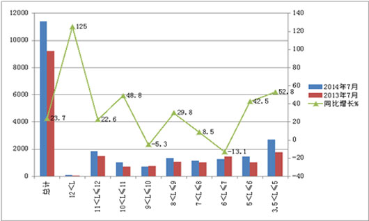 一、根据中国客车统计信息网统计,2014年7月公路客车在各长度段的销售增长状况分析