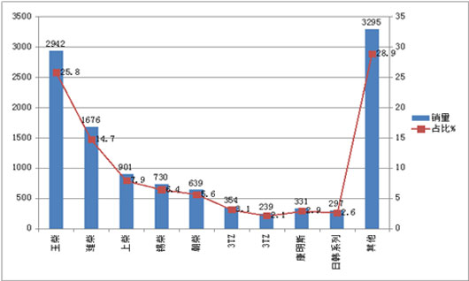 从上表可以看出:2014年7月公路客车总体提高23.7%,是近7个月来公路客车表现最好的月份(前6个月几乎每个月都是负增长)。从长度段看,除去9-10米和6-7米是负增长外,其余段均为正增长,增长最大的是特大型公路客车,其次是3.5-5米公路客车段,再次是10-11米公路客车段,销量最大的是3.5-5米公路客车段其次是11-12米大型公路客车段。