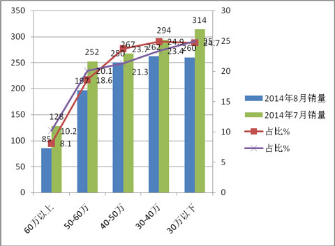 从上图表看出,2014年8月同比大型CNG客车销量最大,增幅最小;其次是中型客车,但增幅次之;销量最小的是轻型型客车,但增幅最大。也就是说中轻型CNG客车的增长是推动2014年8月CNG客车增长的重要动力。