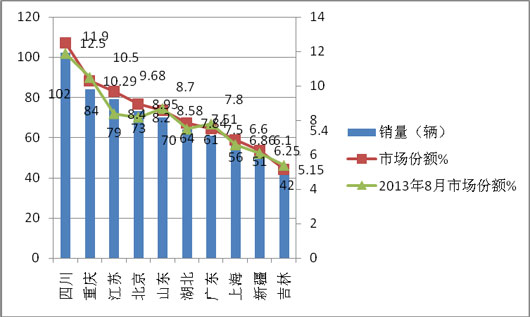 3、前10名销量区域共计销售LNG客车682辆,占据了全国83.6%的市场份额,环比(7月为85.9%)下降了2.3%,同比2013年同期的81.11%却上升了2.5个百分点,可见LNG客车的区域分布极不均衡,且这种不均衡趋势还有加大的迹象。