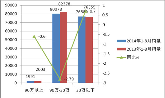 按价格来细分市场,可以将大中客车市场划分为高档客车、中档客车和低档客车市场。大中客车行业专家认为,价格在90万(含90发万)以上的为高档客车,所对应的目标市场主要为运距在300公里以上的高速客运(含高档卧铺客车)、高级景点的高档旅游、大城市的特大型公交、等细分市场,所占的比例一般较小,一般不超过大中客车总销量的3%;价格在30-90万之间的为中档客车,所对应的目标市场主要为运距在300公里以下的中高速客运、中高级景点的高档旅游、大中城市的大型和部分特大型公交车等细分市场,所占的比例一般较大,占据大中客车总销量的比例在50%以上;价格在30万以下的是低档客车市场,所对应的目标市场主要为运距在100公里以下的中低速客运、低级景点的旅游、中小城市的公交、农村客运和城郊公交等细分市场,所占的比例也比较大,占据大中客车总销量的比例在40%以上,因此研究30万以下中低档客车细分市场非常重要。2014年1-8月30万以下中低档大中客市场特点分析如下: