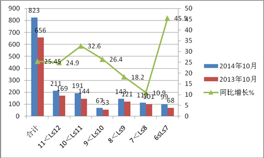 二、按长度段划分,2014年10月LNG客车销量结构分析—11-12米销量最大,6-7米增幅最大。所有长度段增长均为正值
