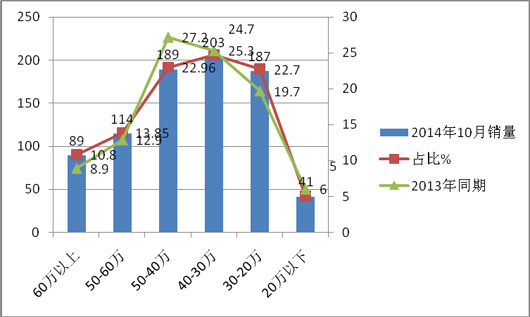 3、价格在20万以下的LNG客车销量比例也比较小,只有5.0%,且同比2013年10月比例有所下降(下降了1个百分点),说明城乡客车市场越来越注重节能环保客车。这一价格区间所对应的产品主要是6米左右的轻型客车。一般说来,6米左右的轻型客车配置CNG的比较少(配置LNG的可能稍微要多些,因为LNG只有一个气瓶,便于小型客车安装)。主要有两个方面的因素制约:第一、6米车轴距太短,车身也不够长,因此,不论是顶置天然气气瓶,还是在车下部放置天然气气瓶,均由于空间限制不好布置。第二、6米车作为公交使用一般都被安排在城乡公交专线或农工专线,离市区较偏远,加气站不方便建制,因此,后患较多,保障较难。而7米以上的公交车型配置天然气的有不少,主要被一些中小城市使用,或者被大城市的郊区线路使用,但价格一般都超过20万。