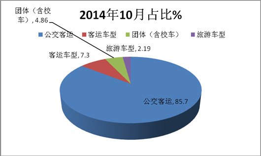 1、2014年10月公交市场是LNG客车的绝对主要领域,占据的额比例在85.7%,但同比市场权重有微弱下降趋势(比2013年同期下降了近0.4个百分点)。