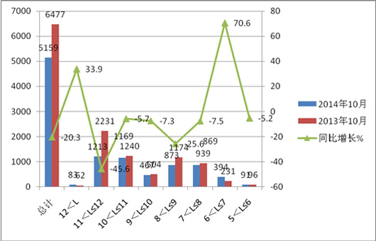 一、2014年10月份各长度段公交车型销量分析—销量同比下降幅度到达20.3%,下降幅度之大在近期少见