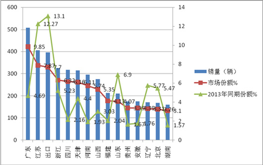 根据最新上牌数据查阅,2014年10月公交车销量、市场份额区域分布统计表:
