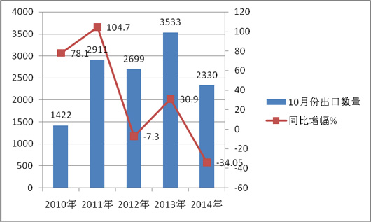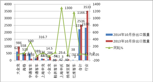 根据中国客车统计信息网统计,50家大中客企业2014年10月出口2330辆,2013年10月出口数量为3533辆,同比下降为34.05%