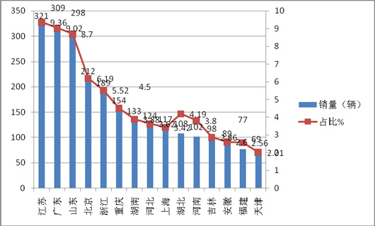 上图表显示,2014年11月前15名新能源客车销售区域共计销售新能源客车2400辆,占据总销量的70.05%,但环比下降了近4.9个百分点(10月5名销量集中度为74.94%)可见,重点区域的市场集中度较高,同时环比减弱。