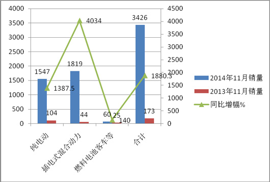 根据最新上牌数据显示,2014年11月份6米(含)以上纯电动客车销售1547辆,插电式混合动力客车销售1819辆,燃料(甲醇)电池客车等60辆。