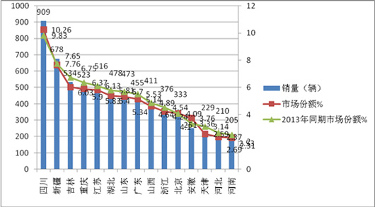 2、前15名主流市场中,四川的市场份额增加最快,下降幅度最大的是天津区域。
