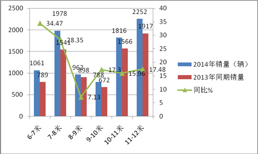 从上图表可以看出:2014年度各月LNG客车销量增幅大小不均,增长最小的4月份只有11.2%,而增长最大的7月份居然达到44.9%,可谓相差悬殊,但均为正值,且年度增幅达到20%,说明总体增长速度尚可。