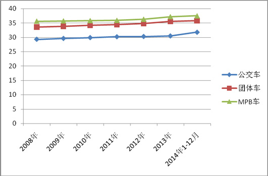 根据有关统计数据获悉(以10米5长度的车型为例来说明),一辆10米5左右的MPB的平均价格一般要比同类型的公交车平均价格要高出6万元左右,比同类型的团体车要高出2万元左右。下表是(以10米5车型为例)统计的2006-2014年1-12月近8年来的MPB、公交车、团体车的平均价(单位:万元)格比较: