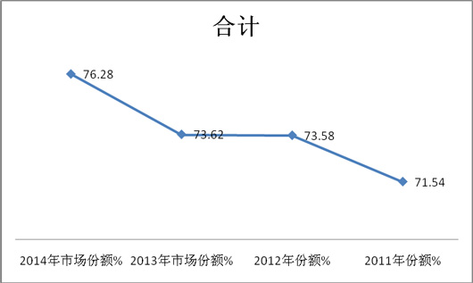 特征一、市场分布不均衡,主要区域垄断程度提高,资源有向重点市场倾斜的趋势,且这种趋势在2014年有明显加强的迹象。表1