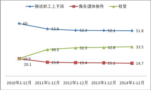 3、团体租赁市场作为团体车市场中重要的细分市场之一,占据团体车市场的比例近年上升趋势非常明显,是团体车所有细分市场中表现最为突出的。市场份额从2010年1-12月的20.1%逐年上升到2014年的33.9%,发展势头非常迅猛.产生上述特点的原因大致如下: