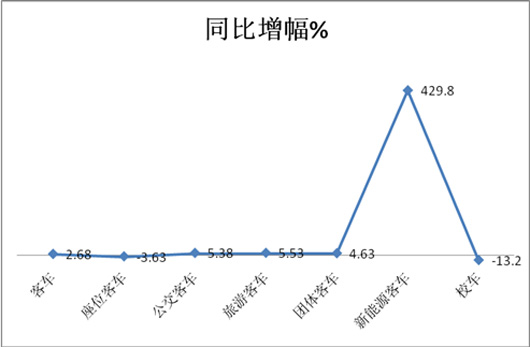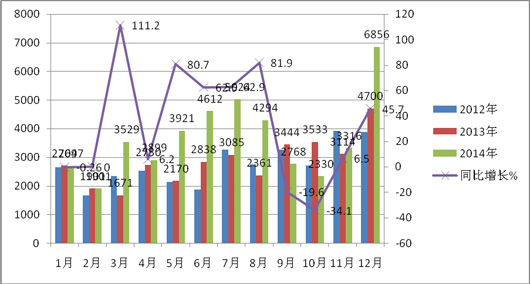 2012年1-12月客车出口数量为32933辆,2013年1-12月出口客车数量为34521辆,同比增长为4.8%,而2014年1-12月客车出口数量为45130辆,很明显,2014年度客车出口同比增幅为21.64%,可见2014年同期增幅增大了近17%,增幅明显加大。