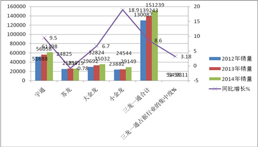 2015年及近3年来三龙一通销量与市场集中度分析表(表4)