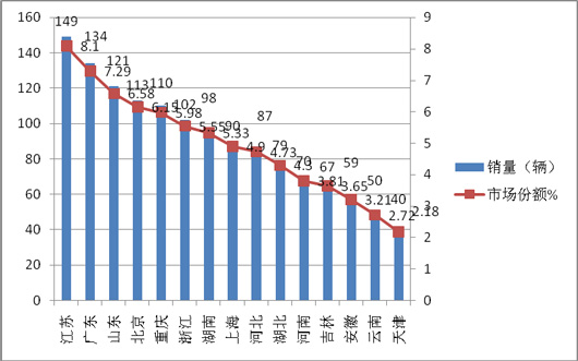 上图表显示,2015年1月前15名新能源客车销售区域共计销售新能源客车1369辆,占据总销量的74.48%,可见,重点区域的市场集中度较高,其余15个区域只有25.5%的市场份额。