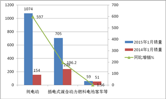 根据最新上牌数据显示,2015年1月份6米(含)以上纯电动客车销售1074辆,插电式混合动力客车销售705辆,燃料(甲醇)电池客车等59辆。