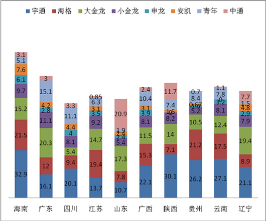 4、从主流客车在上述市场的市场份额占有率可以看出,海南区域竞争最不充分,而广东、四川、江苏等区域是旅游客车竞争比较充分的市场,这给客车制造企业在制定旅游客车市场的营销策略方面提供了主要依据。