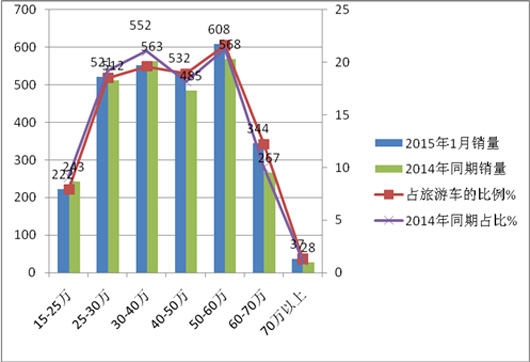 1、2015年1月旅游客车主要销售集中在价格在50-60万、30-40万和、40-50万等区间。50-60万元的销售了608辆,市场比例比2014年同期提高了0.3个百分点;30-40万的价格区间销售了552辆,占据了19.6%的市场份额,但比2014年同期下降了1.50个百分点。25-30万销售了521辆,占据的比例为18.5%,而2014年同期为19.22%,下降了0.72百分点。