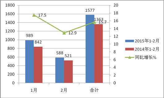 1、2015年1-2月LNG的销量增幅最大的月份是1月份,达到17.5%,销量也是1月份达到最大值,这一点与公交销量的规律基本一致,而2月份由于春节因素,销量增幅变小。