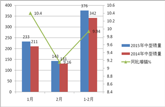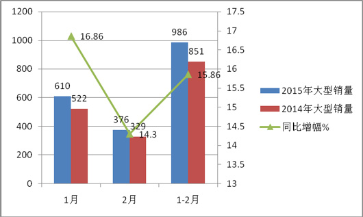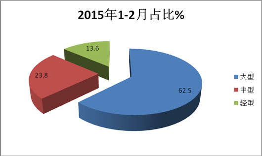 一、2015年1~2月LNG客车总体销售情况分析---总体销量同比呈现15.7%的增幅;大型销量权重最大,但同比比例下降;中型销量权重次大,但同比上升最大;轻型销量权重最小,同比下降幅度次之