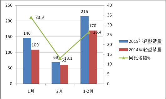 (二)按大中轻车型划分对2015年1-2月LNG客车销量分析。从上述数据可知,2015年1-2月LNG的销量虽然总体基数不大,但增幅趋势超过15%,按大、中、轻划分,同比大型增幅居中,占据的比例也最大,而且呈现上升迹象,而中型增幅最小,占比也在减少;轻型占比最小,但增幅最大,占比增幅也最大。也就是说,2015年1-2月LNG客车的增长主要是依靠大型和轻型客车的增长拉动所致(具体见下表图)。