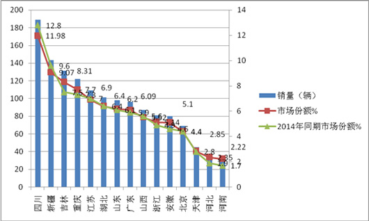3、前15名销量区域共计销售LNG客车1423辆,占据了全国近90.23%的市场份额,而2014年同期是近88.4%,可见LNG客车的区域分布极不均衡,且主流区域市场集中度增加了近1.83个百分点。