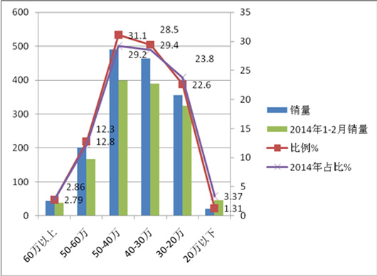 5、同比可知,40-50万和30-40价格区间的销量比例增加迹象明显,而20-30万价格区间的销量比例减少较多,这一细分市场的变化值得注意,60万以上和20万以下的减少也较多。