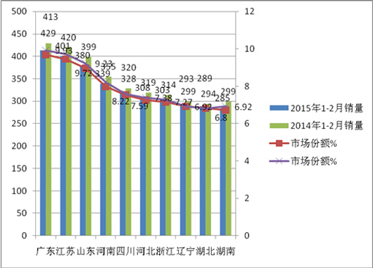 根据上牌数据统计,将2015年1-2月11-12米公路客车销量为4243辆,上述10大主流区域11-12米公路客车共计销售3345辆,同比下降1.8%(2014年1-2月上述十大区域11-12米公路客车销量为4321辆),占据了11-12米公路客车总量的78.8%的市场份额,而2014年同期占据的市场份额为79.9%,市场集中度下降了1.1%。其中2015年1-2月11-12米公路客车产品销量在前10名的全国主流区域市场列表如下: