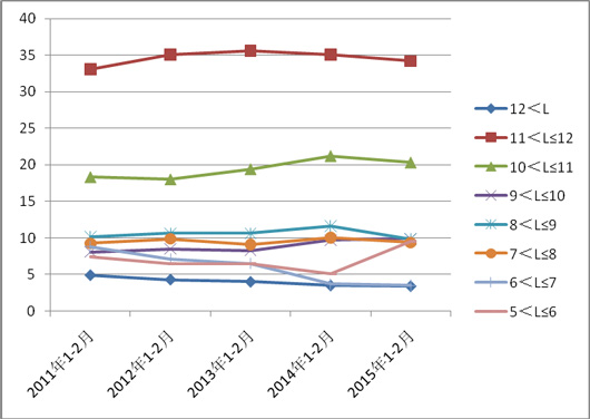 二、11-12米公路客车占据的比例在2015年1-2月继续变小,继续改写了前3年11-12米公路客车占据公路客车总量比例逐年上升的规律(根据近年上牌数据统计计算)