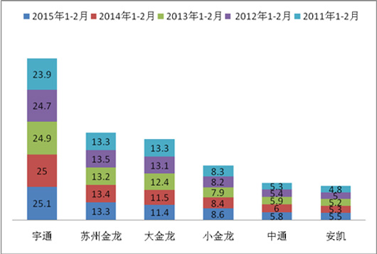 5、老牌子公路客车的生产中通客车,在公路客车这个细分市场表现也不错,2015年1-2月公路客车销量份额处于第五,其传统的强势市场在山东、东北三省、福建等区域,市场份额基本维持在6%左右。