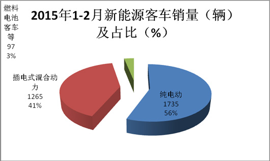 根据最新上牌数据显示,2015年1-2月份6米(含)以上纯电动客车销售1735辆,插电式混合动力客车销售1265辆,燃料(甲醇)电池客车等97辆。