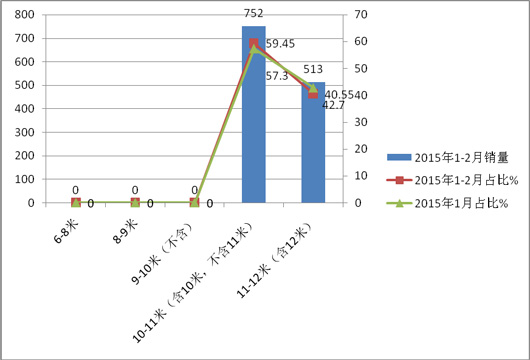1、2015年1-2月纯电动客车销售主要集中在11-12米、10-11米段及6-8米段。10米(不含)以下销量权重占比为41.93%(2015年1月10米以下纯电动客车销量权重为41.9%,同比2015年1-2月10米以下纯电动客车权重上升了近0.03个百分点,进一步细分可以看出,10米以下长度段中实际上是6-8米段纯电动客车销量比例1-2月比1月份增长了1.04个百分点,市场调研表明,增长的原因主要是大城市微循环公交车型开始采用6-8米纯电动客车作为主打车型,是促进6-8米纯电动客车市场比例上升的主要原因之一。而8-9米米纯电动客车的销量比例反而出现了下降,9-10米微升。