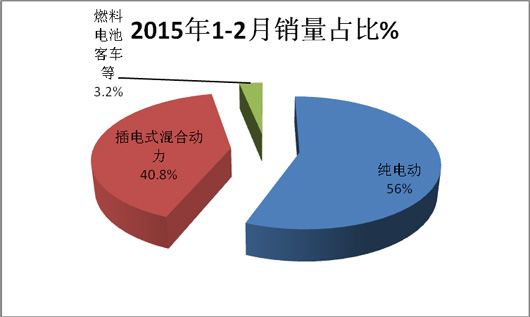 2、插电式混合动力客车2015年1-2月份占比相对2015年1月提高了近2.44个百分点。