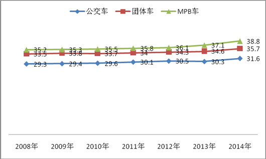根据有关统计数据获悉(以10米5长度的车型为例来说明),一辆10米5左右的MPB的平均价格一般要比同类型的公交车平均价格要高出6万元左右,比同类型的团体车要高出2万元左右。下表是(以10米5车型为例)统计的2006-2015年1-3月近8年来的MPB、公交车、团体车的平均价(单位:万元)格比较: