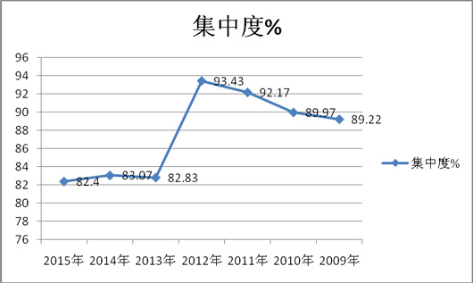 二、重点区域市场集中度分析---2012年前在逐步提高,2013年降低,2014年恢复性提高,2015年同比又出现小幅下滑