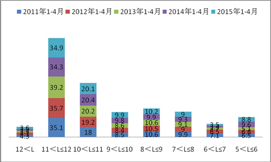 特点二、11-12米公路客车占据公路客车的比例在2015年1-4月出现恢复性增长