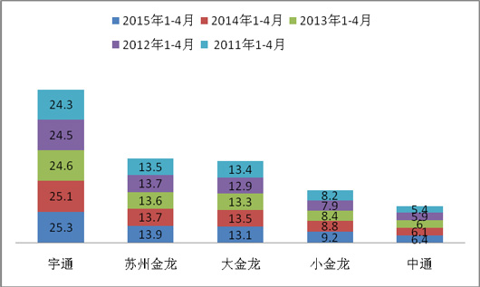 3、大金龙公路客车市场份额第三,盈利能力尚可,但2015年1-4月份额呈现下滑态势,主要是这几年把主要精力投放到5米以下的轻型客车领域了。