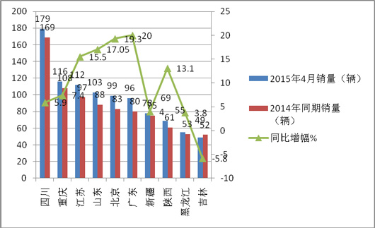 二、2015年4月CNG客车在重点区域销售流向分布分析---前10名区域销量集中度同比下降近1%,销量最大的是四川,增幅最大的是广东,其中9个区域市场销量同比上升,吉林是唯一下降的区域