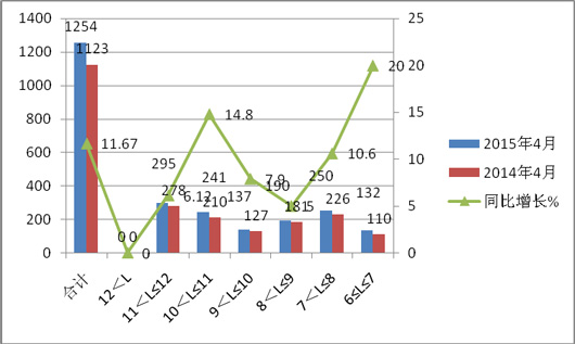 一、2015年4月CNG客车按大、中、轻车型划分销售增幅分析—大型销量最大,增幅次之,轻型销量最小,增幅最大