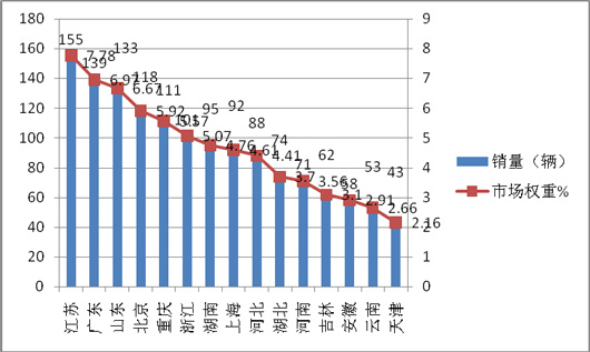 上图表显示,2015年4月前15名新能源客车销售区域共计销售新能源客车1393辆,占据总销量的69.86%,其中江苏区域市场份额最大,可见,重点区域的市场集中度较高,其余15个区域只有30%的市场份额。