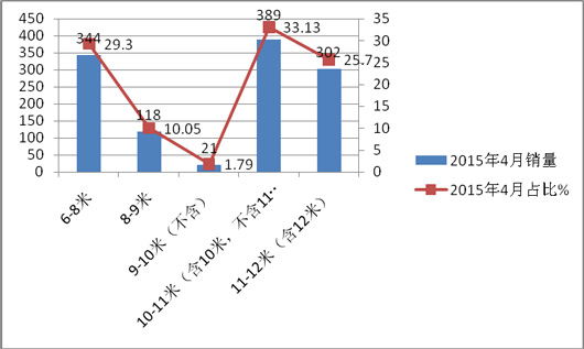(一)2015年4月插电式混合动力客车按长度划分销量结构分析(来自出厂合格证发放数据统计)---10-11米插电式混合动力客车车型销量最大,11-12米销量第二,其余长度段销量为零