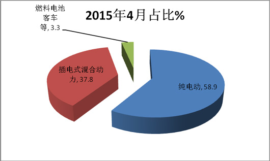 上图表显示,2015年4月新能源客车市场中,纯电动客车占比最大,接近60%,其次是插电式混合动力客车,再次是燃料电池客车。