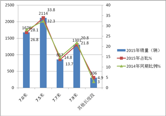 根据车管部门的上牌数据显示,2015年1-5月7-8米公路客车(不含校车、特种客车)销售6254辆,同比增长9.1%,占据公路客车总体市场的份额为10.7%,比2014年同期提高了近0.3个百分点。