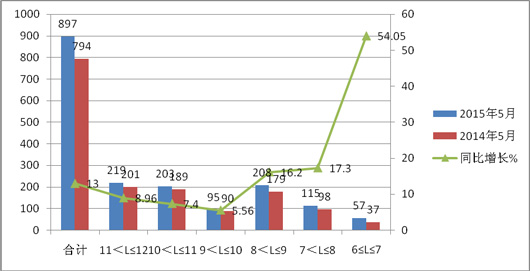 二、按长度段划分,2015年5月LNG客车销量结构分析—11-12米销量最大,6-7米增幅最大