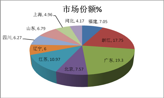 2、2015年1-6月广东是高端客车市场需求量最大的区域市场,其次是浙江,再次是江苏,均是经济较发达的区域市场。说明高档客车市场大小与经济发达程度密切关联。
