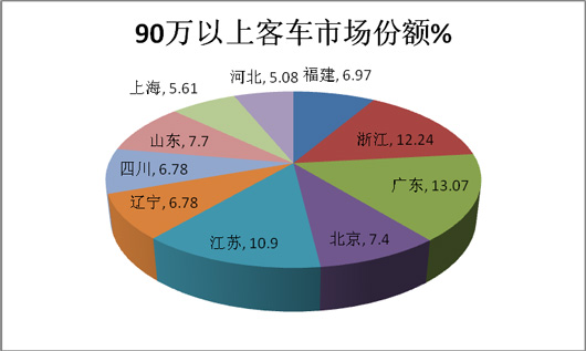 1、福建、浙江、广东、北京、江苏等10个区域市场是90万以上高档客车市场的主要需求市场,集中度比较高。需求比例占整个高档客车市场的82.58%,比2014年同期的近84.11%下降了近1.53个百分点。也就是说,到其他23个区域市场销售高端客车仍有近17.4%的市场机会,比2014年同期提高了近1.53%的市场机会。在90-150万的价格区间,集中度为71.5%,比2014年同期的72.56%,降低了1.06个百分点,说明在该细分市场重点区域的垄断程度有降低的迹象,留给其他区域的机会相对增大,其他区域的机会不到29%;150-200万的价格区间的集中度为95.23%(去年同期为95.28%,同比2015年降低了0.05个百分点,说明在该细分市场重点区域垄断程度有较小幅度降低的倾向),留给其他区域的机会不到5%;200万以上的集中最高度为90.86%(2014年同期为92.51%,同比2015年下降了近1.65个百分点,说明在该细分市场重点区域垄断程度有减小的迹象,留给其他区域的机会仍然有9.14%。也就是说,90万以上高档客车在200万以上区间集中度次高,90-150万集中度最低,150-200万区间最高。